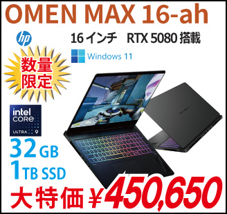 HP OMEN MAX 16-ah0057TX ゲーミング ノートパソコン B9FJ3PA#ABJ Windows11 CoreUltra7 255HX メモリ32GB SSD1TB 16インチ RTX5080 メーカー保証 新品未使用品