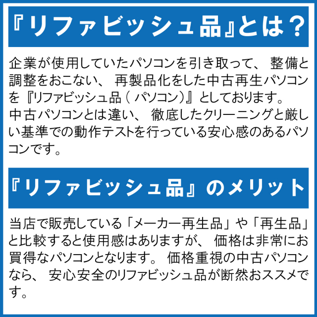 A.リファビッシュ品パソコンはすべて動作確認済みの商品です。安心してご購入いただけます。