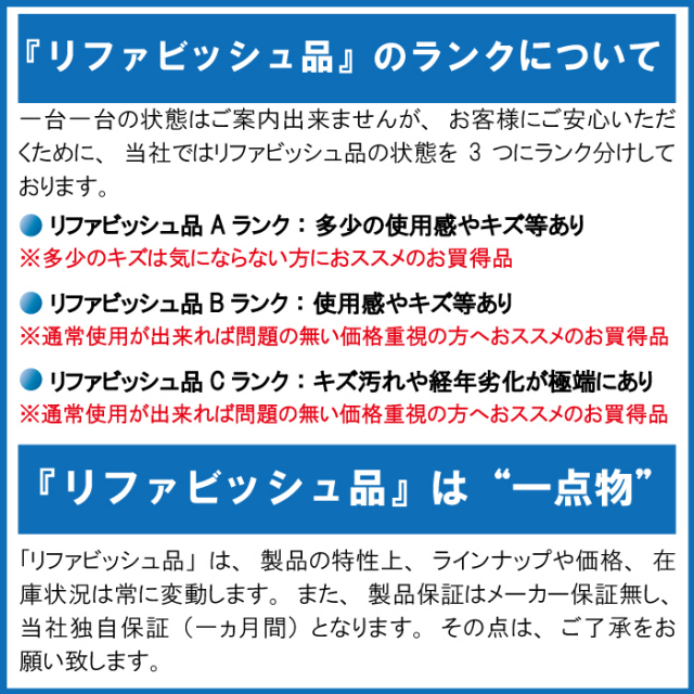 A.リファビッシュ品は再生品よりも使用感がある場合がありますが、その分価格が非常にお買い得です。コストパフォーマンスを重視する方には、品質と価格のバランスが取れたリファビッシュ品がおすすめです。