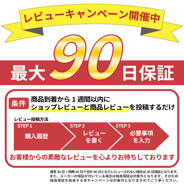 A.到着後1ヶ月の当社独自保証が適?されます。また商品到着から1週間以内にレビューをご記入頂くと30日の延長保証が適用されます。