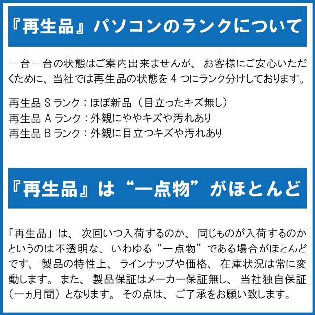 ・パソコン及び、周辺機器は精密機器です。性質上、当方検査結果に問題がなくとも、使用されている間に不具合が発生する可能性があります。ご了承ください。