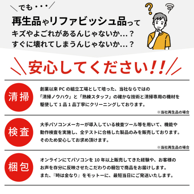 A.リファビッシュ品パソコンはすべて動作確認済みの商品です。安心してご購入いただけます。