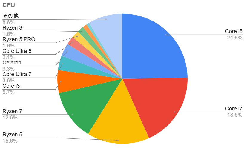 人気が高いCPUは Core i5/i7、Ryzen 5/7 の中位〜上位クラスです。価格と性能のバランスが良く、日常利用からビジネス用途まで快適に使用できます。